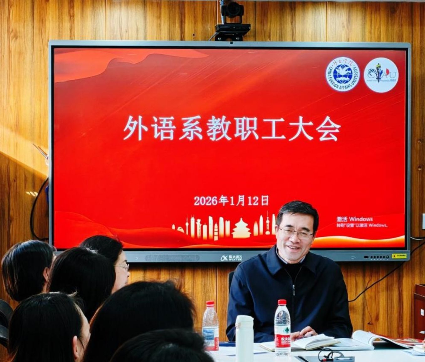 外交学院外语系简报 2026年第1期 ———————————————————————————————————— 外语系召开全系教职工大会 2026年1月12日,外语系在展览路校区召开全体教职工大会。会议由外语系主任王晓侠老师主持,高飞院长出席并做重要讲话。 首先,王晓侠主任全面汇报了外语系组织构成、教师队伍、专业设置、学生培养、合作院校等基本情况,详细分析了外语系教学与科研当前面临的主要挑战,从调整专业建设方向、创新教学科研模式、拓展学生培养平台等三个层面提出外语系教育教学改革面向国家战略需求,将外语学科与区域国别研究深度融合的总体思路和主要举措,强调要统筹教学、科研与人才培... …