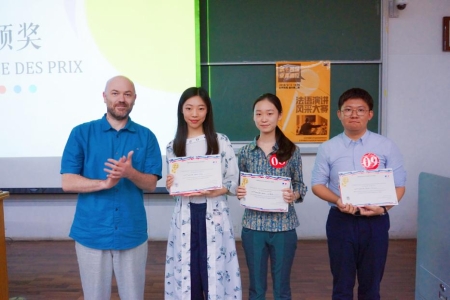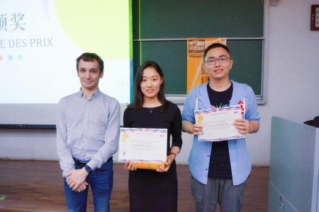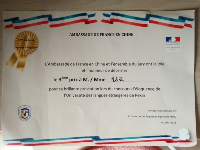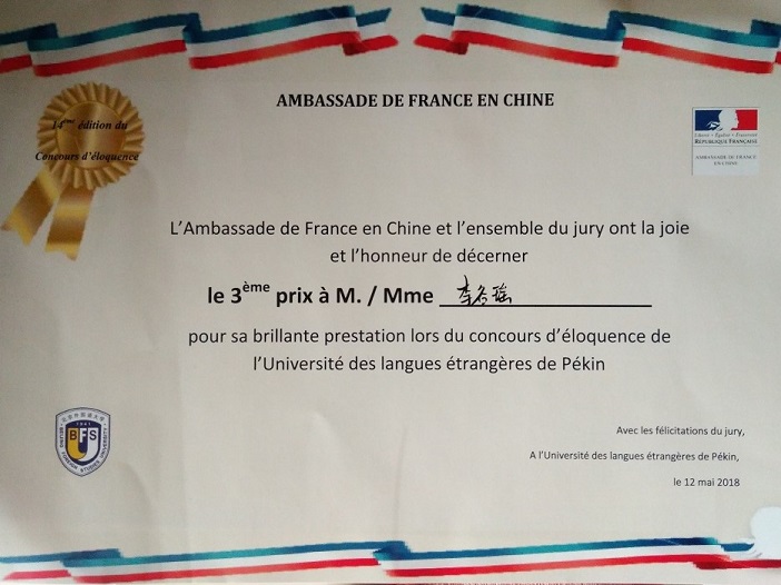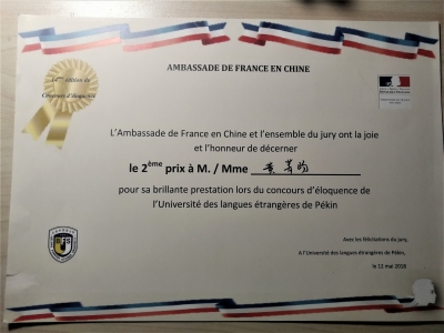 2018年5月12日,第十四届京津高校法语演讲风采大赛在北京外国语大学拉开帷幕。经过校内初选,本次决赛共十一名参赛选手,他们分别来自外交学院、北京语言大学、国际关系学院、中国传媒大学、河北工业大学、对外经济贸易大学和北京外国语大学。最终,我系两名同学黄菁旸、李谷瑶分别以第二名、第六名的成绩获得本次大赛二等奖和三等奖。