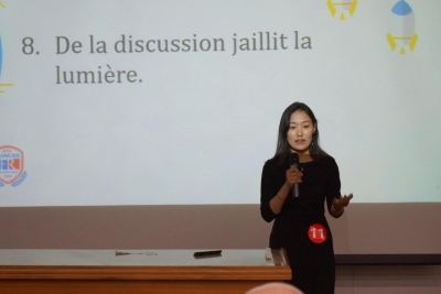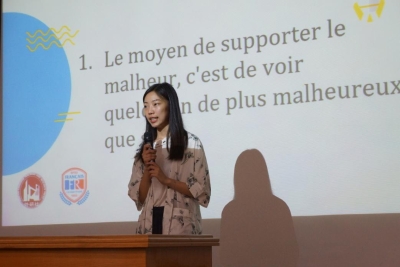 决赛分为两轮,第一轮定题演讲。选手依据事先确定好的顺序,围绕 « Quand on n’a pas ce que l’on aime,doit-on aimer ce que l’on a?»这一主题,依次发表限时4分钟的演讲并回答评委的相关提问。如何确立新颖的观点、拥有得体大方的演讲姿态,是本环节得分的关键。第一轮得分前8名进入第二轮即兴演讲环节,随机抽取演讲题目,思考30秒后开始限时2分钟的即兴演讲,此环节对选手的心理素质和临场应变能力要求较高,也需要扎实的语言基础。
