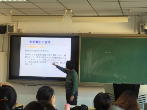 这次演讲的主题是日语的新闻翻译,不论是研究生还是本科高年级,外交学院的日语专业都开设有翻译课程,而且作为外交学院的语言学习者,新闻翻译更是极其重要的必备素质,因此受到了系里老师的重视,同学们更是踊跃参加,日语专业研一的同学大清早就坐着校车赶来,另外还有研究生二年级和本科四年级的同学助阵,日语三个年级的同学组成了热烈的听讲团。