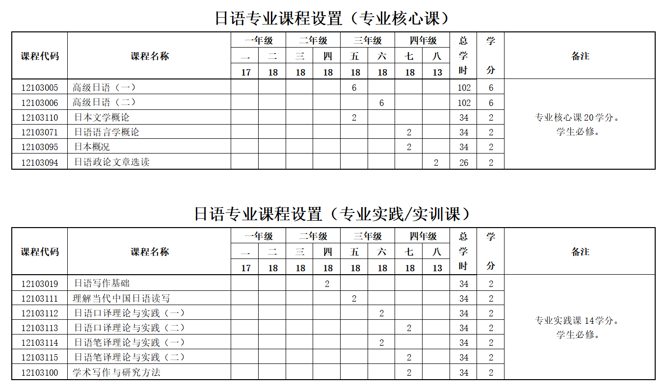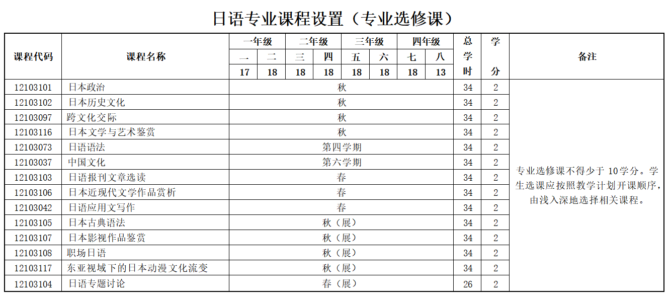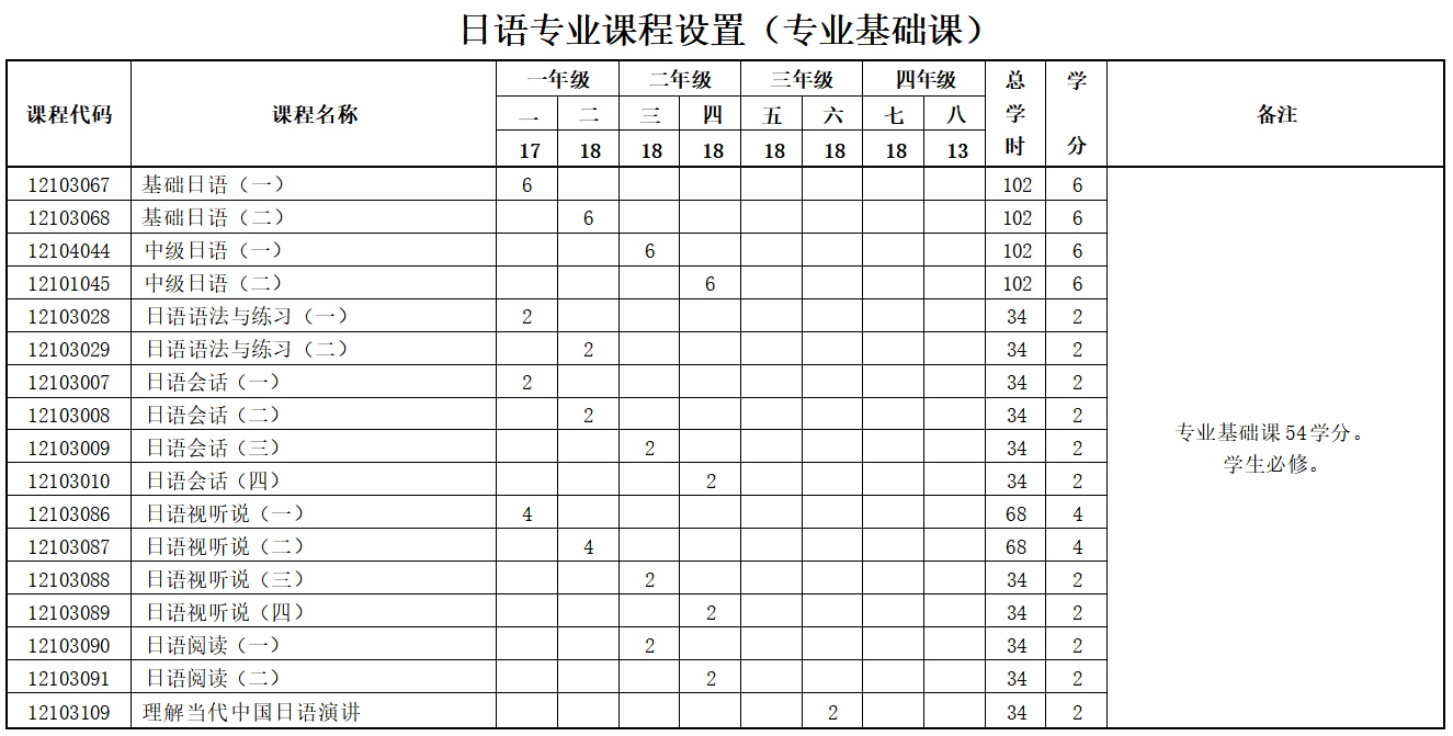 注: 日语专业开设的课程,无特殊情况,均为日语授课。