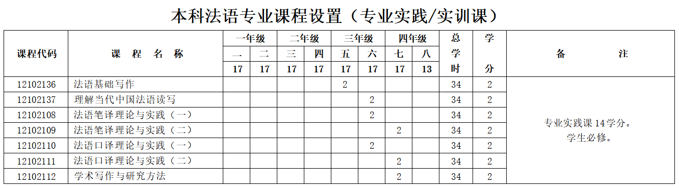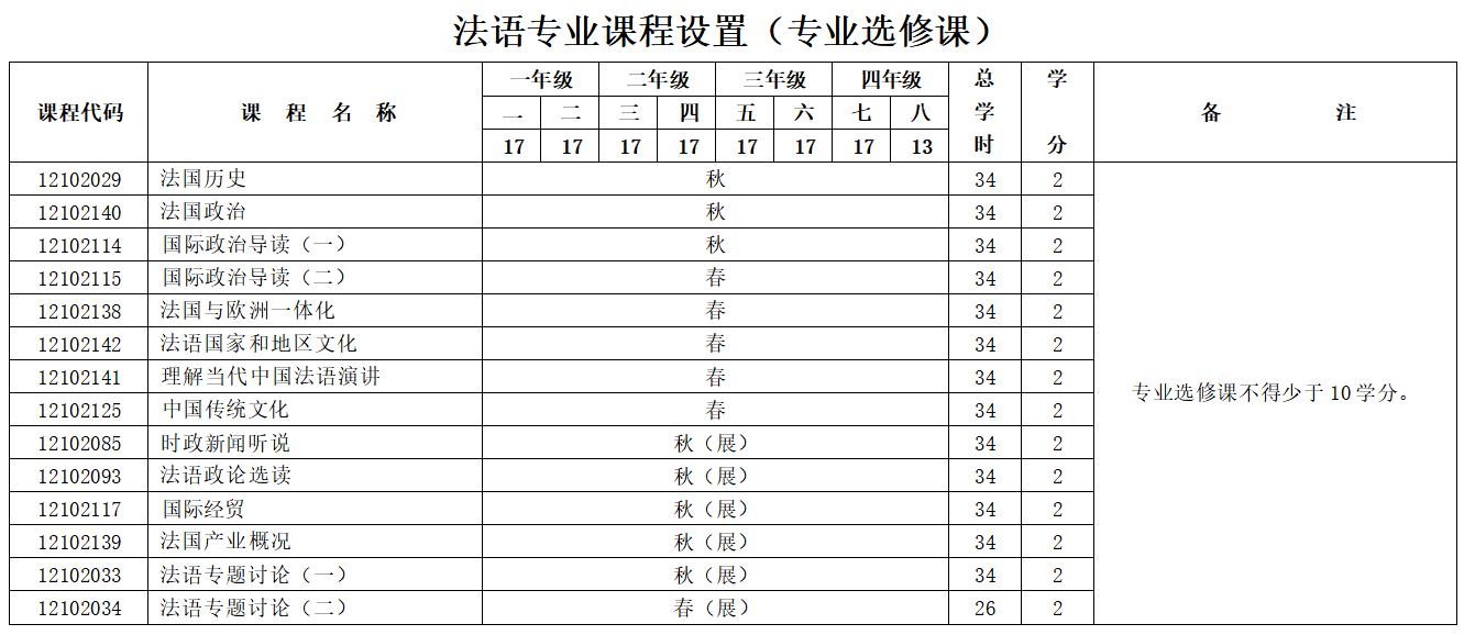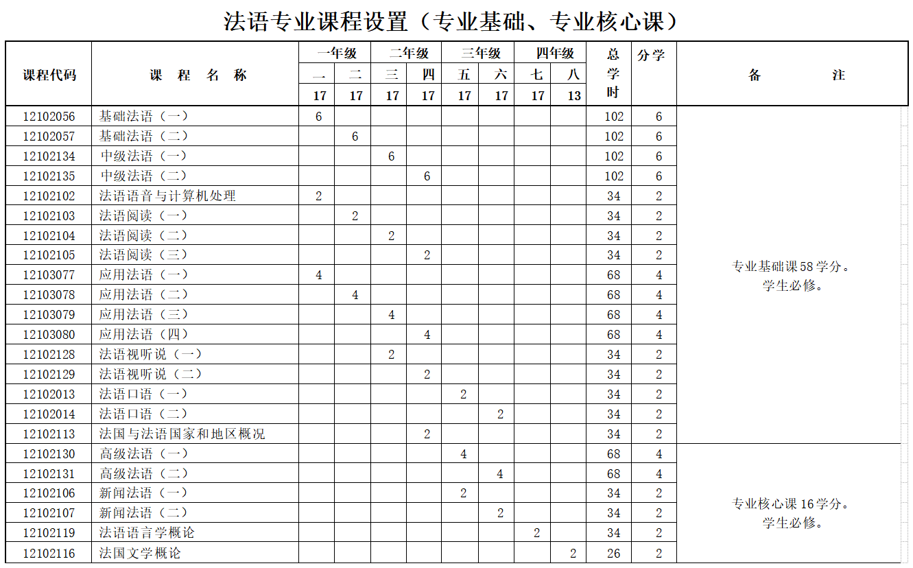 注: 法语专业开设的课程,无特殊情况,均为法语授课。