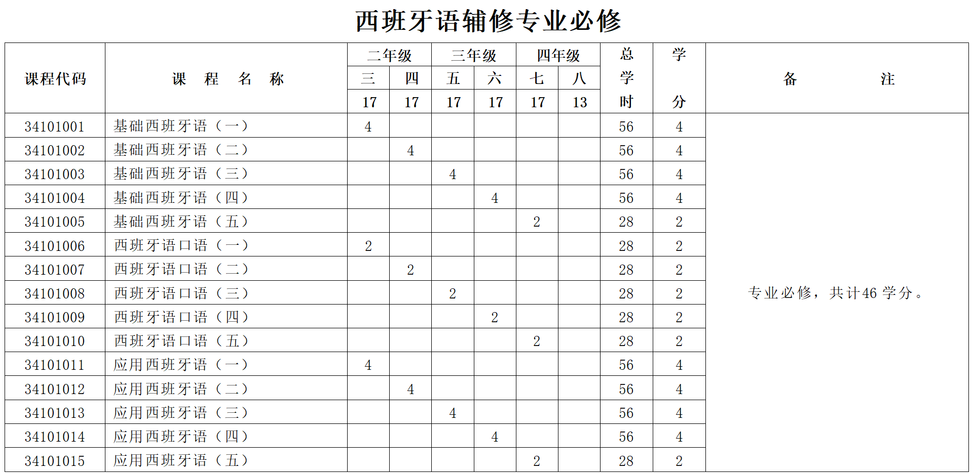 基础阶段:基础西班牙语(一至四),应用西班牙语(一至四),西班牙语口语(一至四)