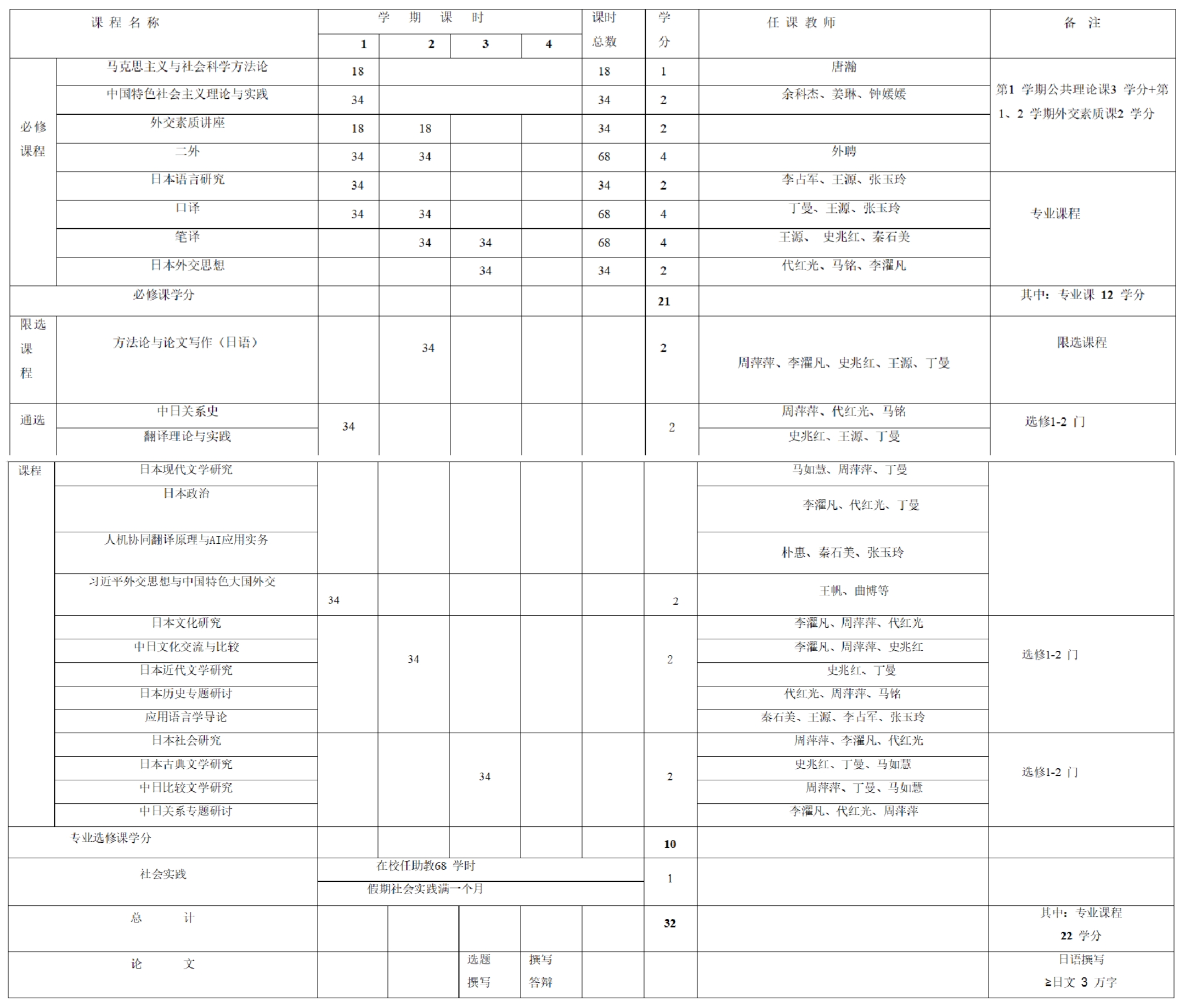 专业必修课程 12 学分,其中第一、二、三学期各占 4 学分,分别为《日语语言研究》课 2 学分,《口译》课 4 学分,《笔译》课 4 学分,《日本外交思想》课 2 学分;