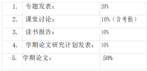 本课程的考核方式包括课堂讨论、专题报告、研究计划及学期论文,其分值分配如下: