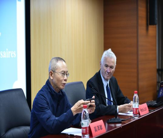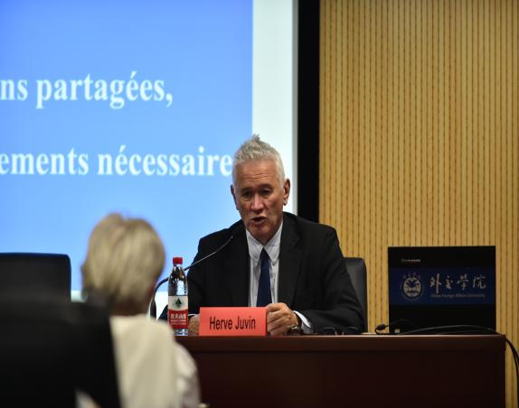 2023年9月25日下午,应外语系邀请,欧洲议会议员Hervé Juvin先生、France Jamet女士莅临我院沙河校区,于行政楼4012会议室为法语专业师生做题为“Les émotions partagées, la voie des apaisements nécessaires”(情感的分享,平和的必经之路)的讲座。本次讲座由外交学院外语系兼职教授吴泽献大使主持,中国旅法艺术家金丹女士、外语系各年级法语专业同学聆听了本次讲座。