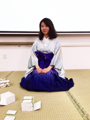 晚上六点半,212教室,在身着和服的李政奕同学的带领下,大家走进了歌留多的世界。短暂的基本讲解结束之后,由身为“初心者”的李政奕与平措卓玛两位同学为大家表演了一场竞技歌留多的比赛,过程紧张激烈,平措卓玛同学在即将进入赛点的时刻逆转战局,进入了最后的命运战(双方各剩一张牌)。