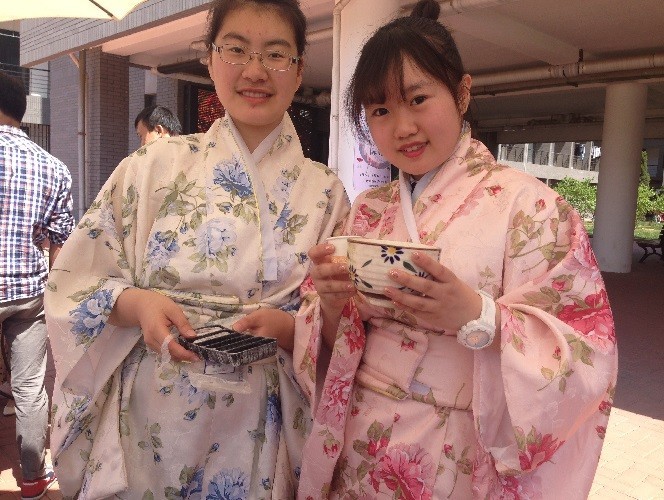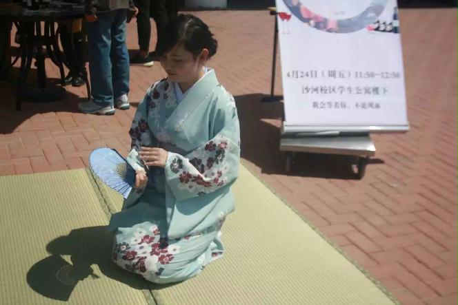 外语系大一日班张靖婕和樊子贤同学身着和服,为大家带来正宗的抹茶体验。
