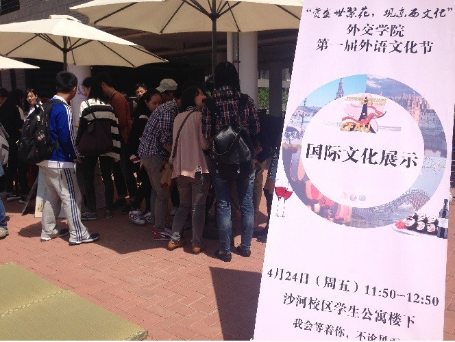 4月24日中午,作为首届外语文化节的一部分,外语系学生会在宿舍楼下组织了别开生面的国际文化展示活动。本次活动旨在宣传外语系特色文化氛围,展示推广法日西三语文化,提升他系同学对法日西三语文化的认知层面,从而将外语魅力推广到其他系别;同时增加外语系学生的学习兴趣,在另一种层面上促进文化理解。