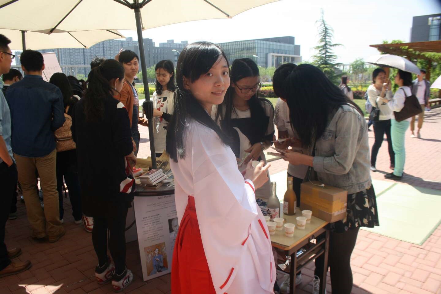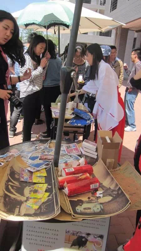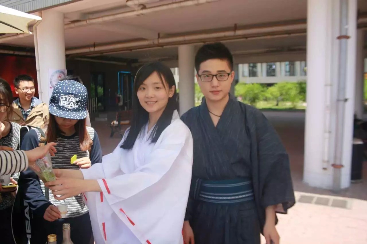 外语系大一日班刘叶身着二尺袖和服为大家提供日本梅酒品鉴,工艺品展示售卖。