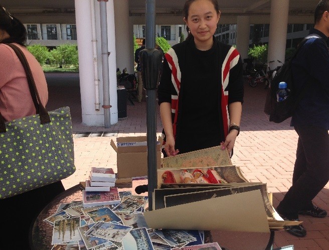 外语系大一法班周梦蝶在摊位前展示充满法国风情的海报、明信片。