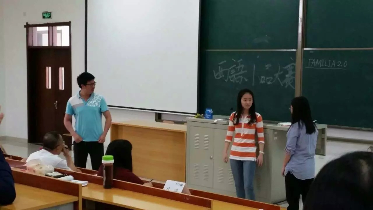 2015年4月27日上午8点40分,由外交学院外语系西语教研室与系学生会共同组织的外交学院西班牙语小品比赛在教学楼212教室举行。此次比赛邀请了西班牙语教研室的姜曙、王晨颖和叶譞三位老师来担任评委。西语班的同学们在经过了多日精心的准备之后,在台上展现了自己的风采。