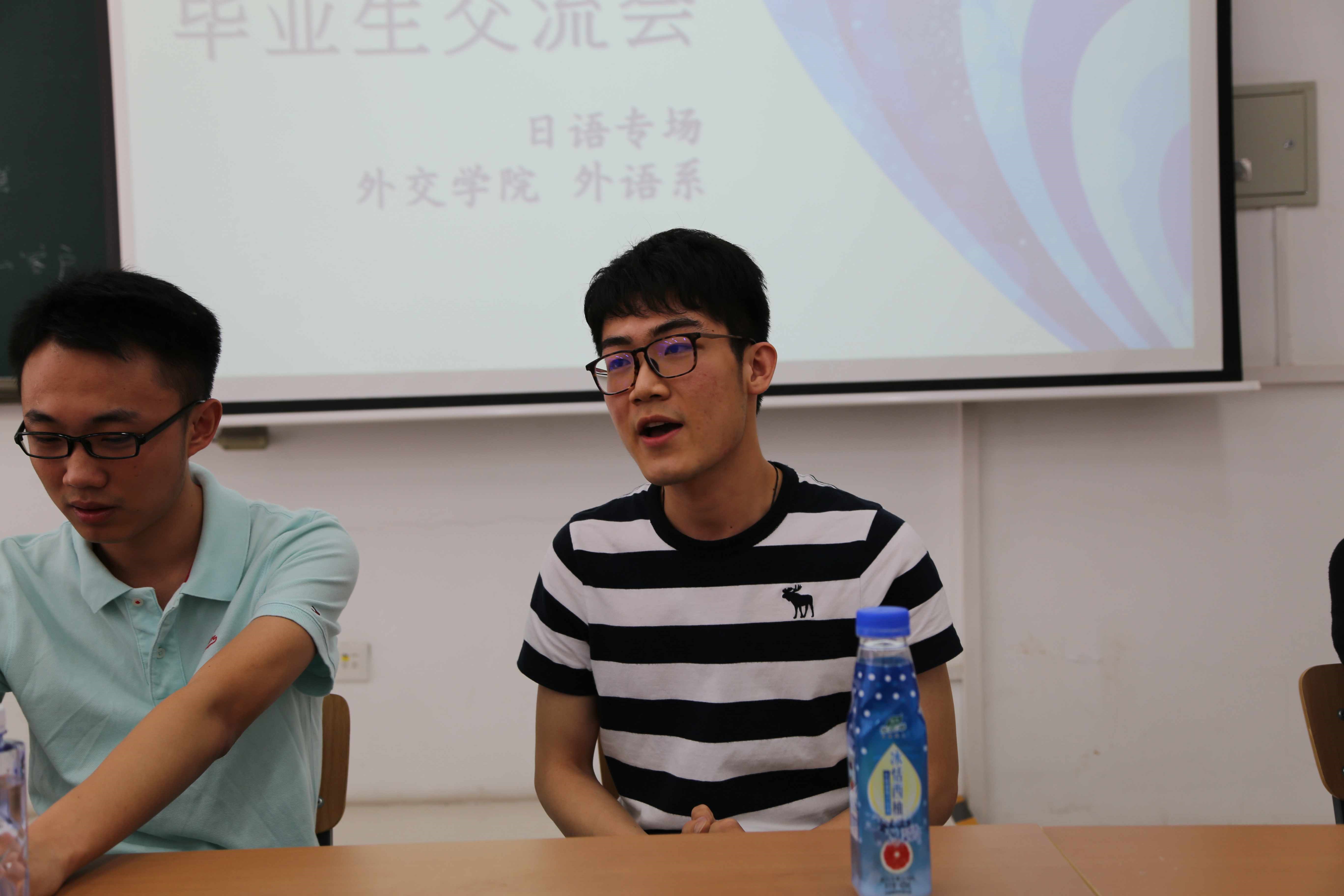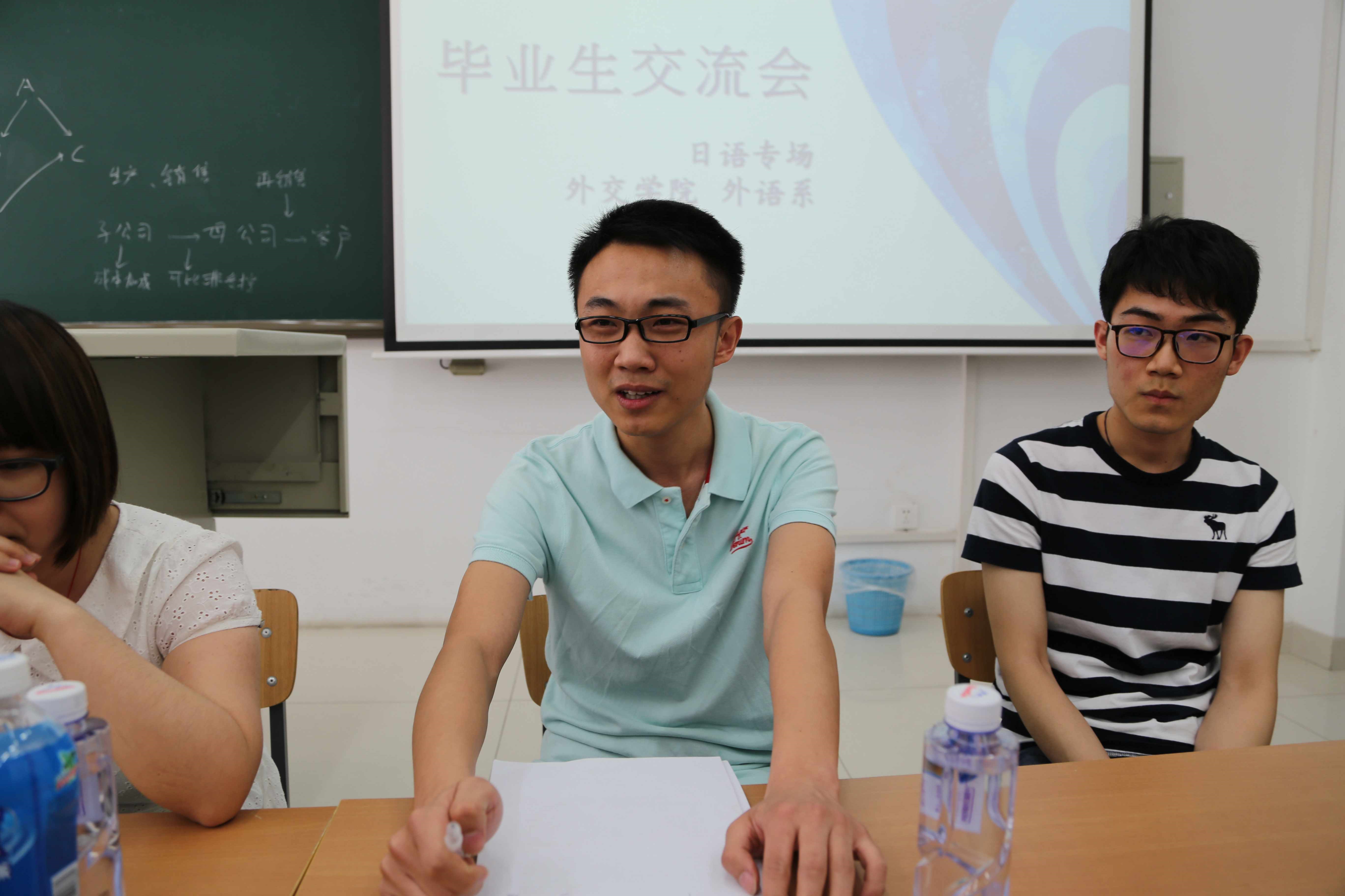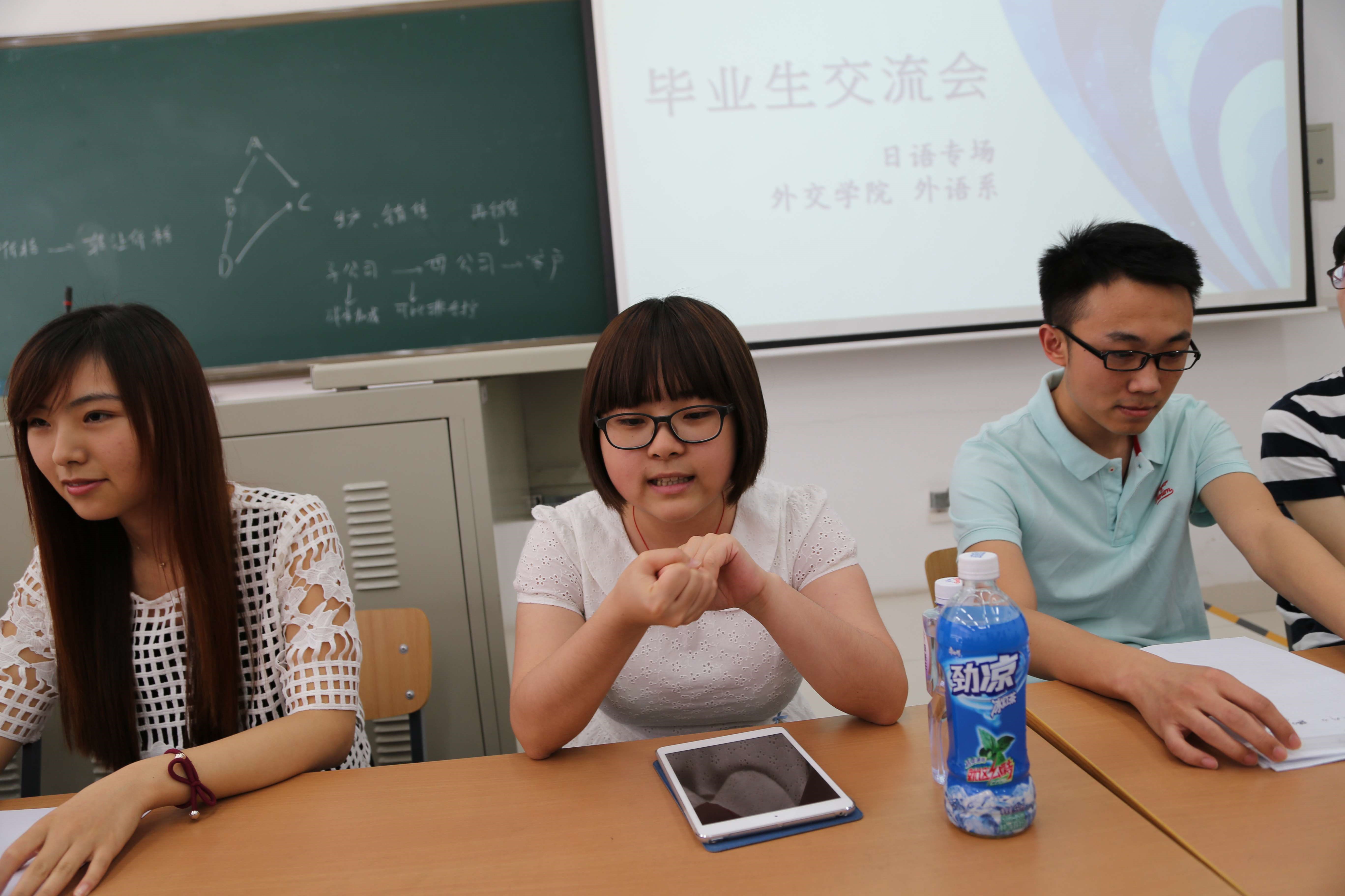 为加强在校同学与优秀毕业生之间的交流与沟通,帮助同学们把握更多就业信息,6月3日下午1:30,外交学院外语系日语专业优秀毕业生经验交流会在教学楼117教室成功举行。参加本次经验交流会的学长学姐来自不同的就业方向,有留学的同学,也有就业和保研的同学,大家都十分优秀,向学弟学妹们分享了他们就业、升学及其他一些不一样的经历。