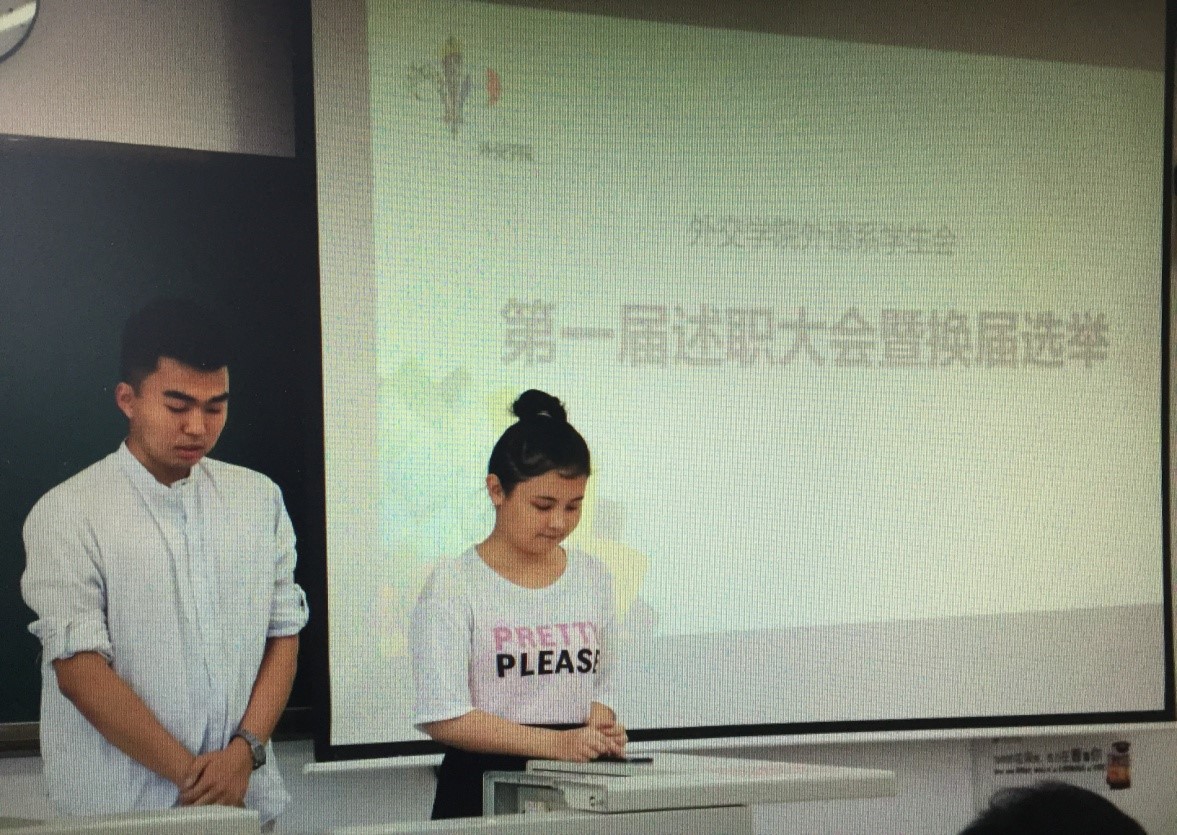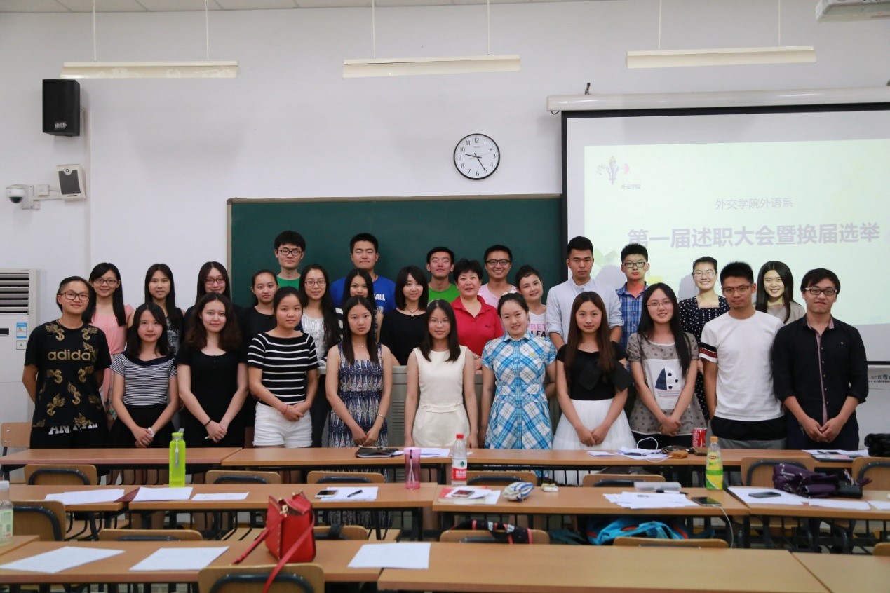 6月17日下午6点,外语系学生会述职大会暨新一届系学生会干部选举大会在教学楼121教室举行,外语系党总支书记袁慧燕老师和辅导员郭洁威老师共同出席了大会。
