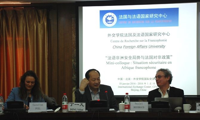 2016年1月10日,由外交学院法国与法语国家研究中心主办的“法语非洲安全局势与法国对非政策研讨会”在我校展览路校区国际会议中心举行。来自法国波尔多大学、法国观点周刊、国务院发展研究中心世界经济研究所、社科院西亚非洲研究所、现代院非洲所、传媒大学、进出口银行、国防大学防务学院、国际关系学院、北京外国语大学法语系、上海国际问题研究院及我院的近20名学者参加了此次研讨会。外交学院相关专业研究生也旁听了本次研讨会。