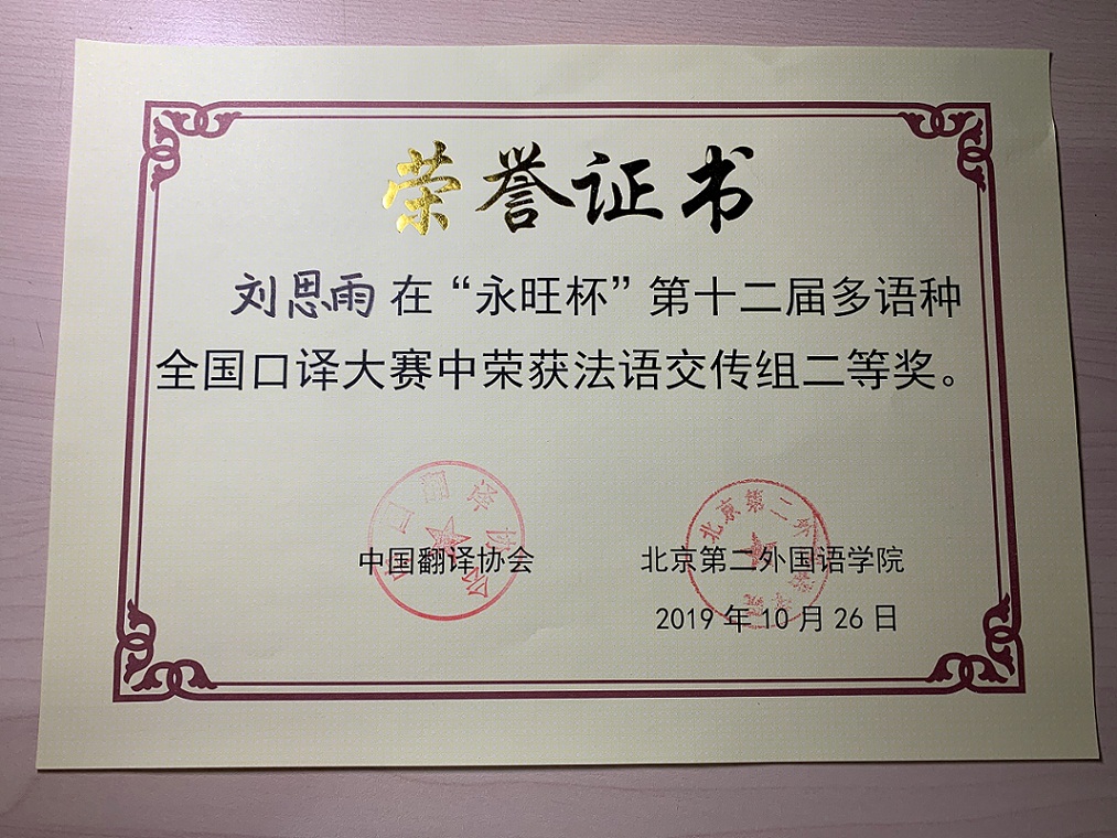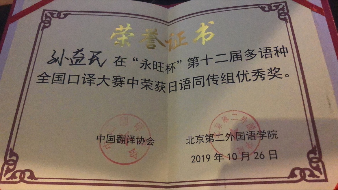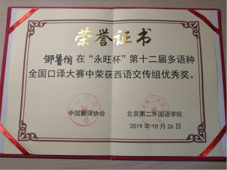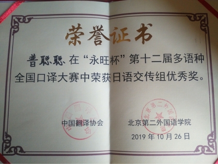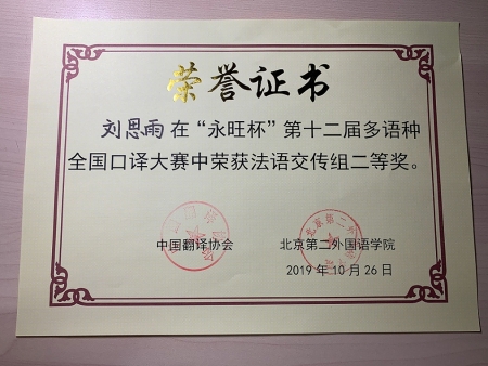 2019年10月26日,第十二届“永旺杯”多语种全国口译大赛在北京落下帷幕。本届大赛由中国翻译协会与北京第二外国语学院共同主办。大赛分初赛、复赛和决赛三个阶段,比赛内容分为外译中和中译外两个环节,内容涉及政治、经济、科学、文化等多个领域。在激烈紧张的角逐当中,我院外语系的参赛学生以标准的语音、娴熟的技巧、得体的风格及专业的素养赢得了评委的好评。最终,刘思雨同学获得法语交传组亚军(二等奖第一名),普聪聪同学、孙益民同学、邹鲁佾同学分别获得日语交传组、日语同传组及西语交传组优秀奖。
