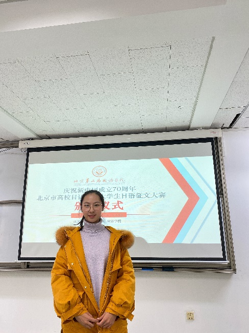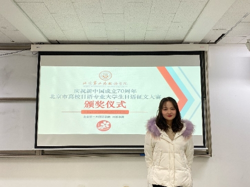 2019年11月22日,在北京第二外国语学院举办的“庆祝新中国成立70周年·北京市高校日语专业大学生日语征文大赛”中,我校外语系日语专业同学发挥出色,在与北京大学、北京外国语大学等高校参赛选手的角逐之中斩获多项大奖,取得优异成绩。其中,梁家颖同学荣获一年级组特等奖,王逸然同学荣获一年级组二等奖,孙荺涵同学、梁佩仪同学均荣获二年级组一等奖,郭倩阳同学荣获二年级组优秀奖,范维同学荣获三年级组三等奖。
