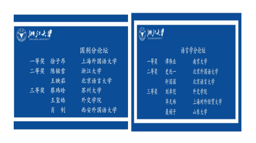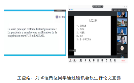 论坛中,我系王玺皓同学提交的《公共危机深化了区域间主义:新冠疫情推动欧盟-东盟合作升级》一文紧跟时事,结合新冠疫情,重点论述公共危机对区域合作所带来的正向影响效果及其借鉴价值;我系刘卓恺同学提交的《非范畴化视阈下法语名词补语零冠词的使用条件研究》一文将法语中“N1 de N2”这一常见结构基于非范畴化理论进行了全新分析诠释,并提出了今后结合心理语言学、语言类型学等分支,进一步完善本研究的构想。两位同学的精彩发言获得所在分论坛评委老师的一致好评,最终,王玺皓同学获国别区域研究分论坛三等奖,刘卓恺同学获语言学研究分论坛三等奖。