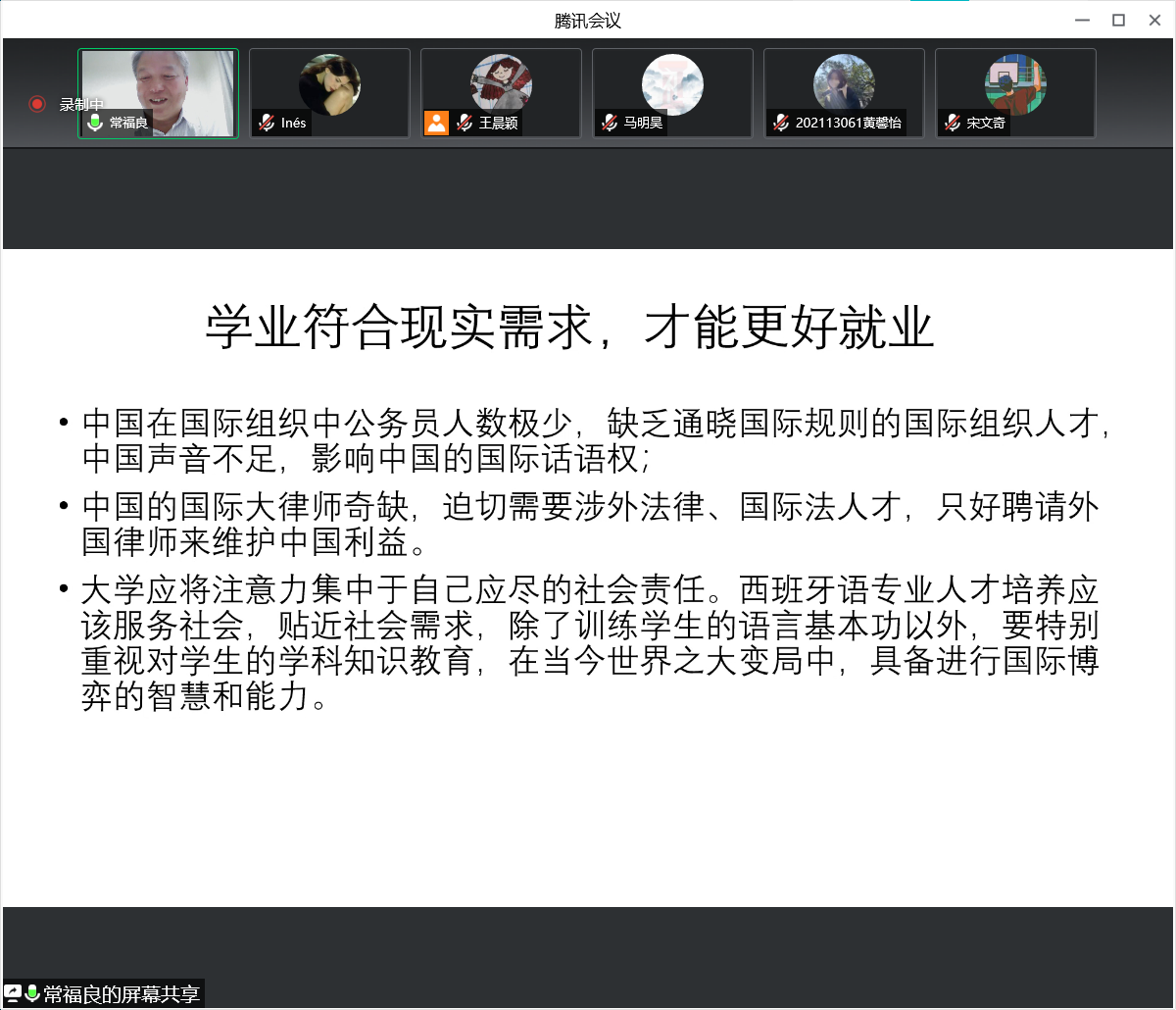 常老师提出“理念决定方法”的思路,提出了有关“新时期西语教学与学习应该注重什么”的问题,并根据党的十九届五中全会精神,指出西班牙语教学和研究都应贯彻党的新发展理念,推动其高质量发展。常老师简要的介绍了高校西班牙语专业的发展历程,指出面对21世纪的大学生,西语教学应克服以往的固化思路。同时,常老师还指出,世界大格局正在发生变化,高等教育也要改革创新。常老师就以下三个方面进行了讲解: