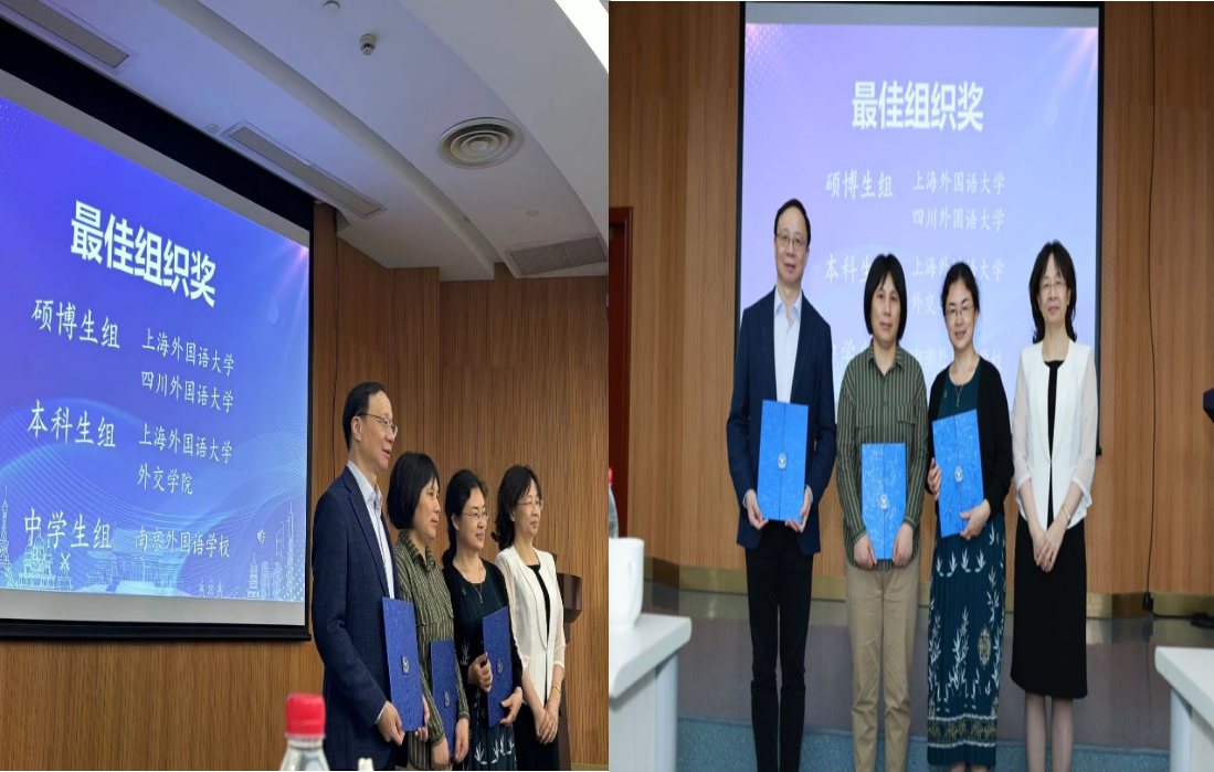 王晓侠教授为全国法语专业本硕博和中学生学术创新论坛决赛一等奖获得者颁奖,并代表外交学院领取了该论坛授予我院的“最佳组织奖”。
