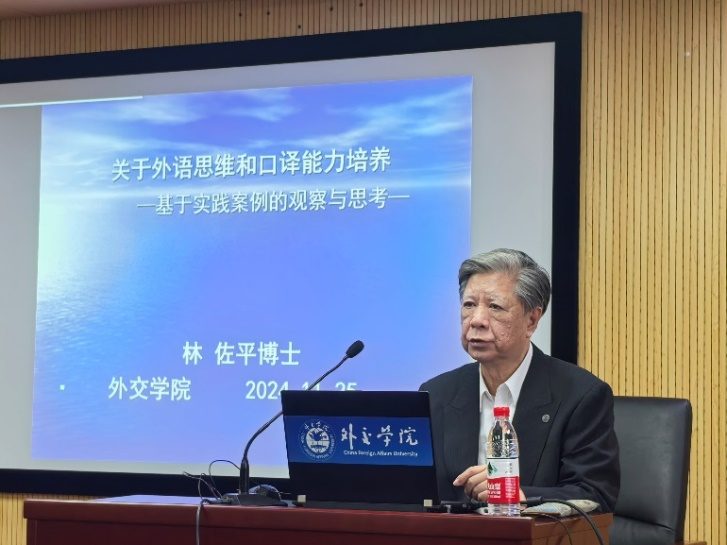 2024年11月25日下午,曾任中国教育部中国教育国际交流协会常务理事、副秘书长和中日友好协会理事林佐平博士应邀来我院进行了一场关于外语思维和口译能力培养的讲座。讲座地点为沙河校区行政楼4012会议室。讲座由外语系史兆红教授主持,外语系日语专业2022312班本科生以及研究生部2024级日语语言文学专业、2024级日语口译专业的硕士研究生参加了此次讲座。