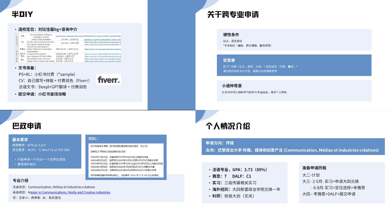 首先进行分享的法语专业的邱子菡学姐,她申请到了巴黎政治大学的传播、媒体和创意产业。学姐先详细介绍了海外硕士申请的整个流程,包括选校定位、文书准备、提交申请等环节,并分享了如何根据自己的背景和兴趣选择合适的学校和专业,给同学们提供了宝贵的经验。其次,介绍了巴黎政治大学申请的一些基本要求,如成绩要求、语言要求等。最后,学姐还强调了关于跨专业申请的硬性条件、软背景和小语种背景,让同学们对这方面的内容有了更加详细的了解。