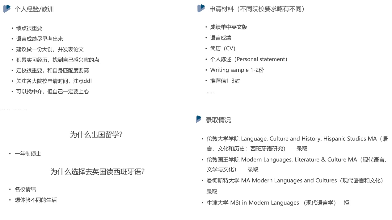 第二位进行分享的是西语专业的曹怡青学姐,她收到了伦敦大学学院、伦敦国王学院和曼切斯特大学三所学校的offer。学姐结合自身申请成功的经验,着重提醒同学们绩点的重要性,以及语言成绩的准备宜早不宜晚,建议同学们在学有余力的同时能够参与大创项目并发表相关论文,多积累实习经验,找到自己的学习兴趣及未来的研究方向。此外,学姐还介绍了申请时的重要申请材料,提醒同学们要找到和自身匹配度高的学校,并关注各大院校申请时间。
