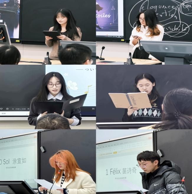 三大语种赛场各具风采,在形式内容上展现出鲜明特色。法语班双人主持,默契十足;日语班深耕文学,古韵悠长;西班牙语班即兴朗诵,尽显胆识。老师们认真聆听,全面评审,既有对专业语种发音要点的考察,也有对仪态风范和临场反应的考验。