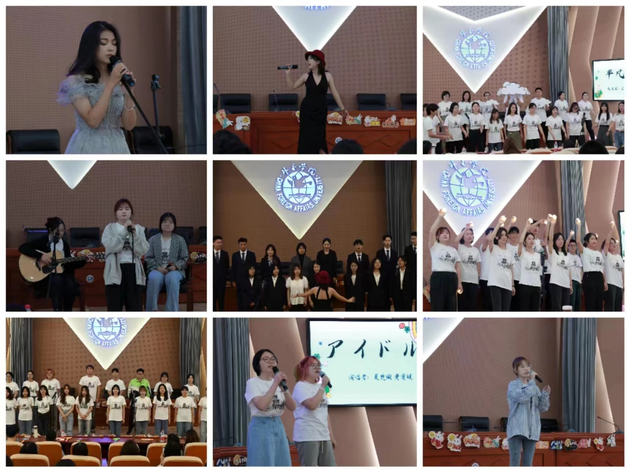 热场游戏后晚会节目正式开始,凌超婷同学以一曲《长相思》带同学们走进烟雨暮色中流动的绵延的相思与无垠的岁月;罗佳妮同学在《Paris in the rain》用慵懒又带着些俏皮的歌声使同学们感受着浪漫的巴黎风情;2023级日语班全体新生合唱《稻香》,炊烟袅袅铺满稻花的场景立刻浮现在脑海之中;李忠睿同学可爱诙谐地演唱着摩登又复古的《That man》,浑身散发独特的魅力;孟诗淼,梁雅晗,张羽佳同学用吉他自弹自唱《奇妙能力歌》,通过温柔的歌声体现故事中女孩面对爱恋时的矛盾与细腻的情感;2023级西班牙语班全体同学合唱《平凡之路》,表达着对过去的告别与对未来的期盼。