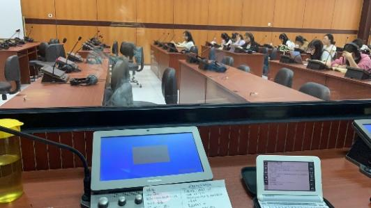 本次讲座在信息楼112同声传译教室进行,采取线上线下相结合的方式,在主讲人佐藤利行教授进行线上讲座的同时,日语口译专业的研一学生还为在场的其他同学进行同声传译,形式十分创新。