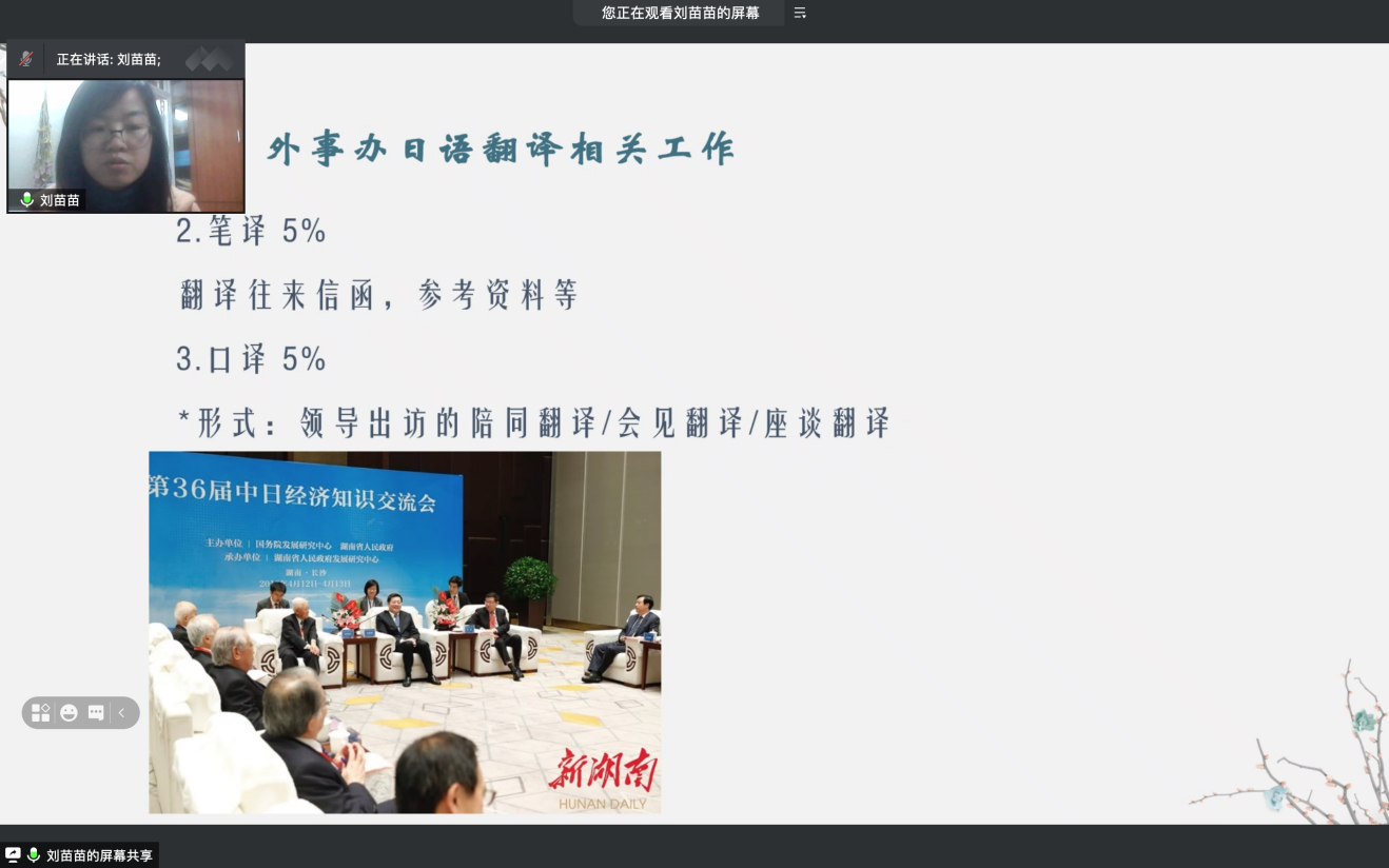 4月19日,湖南省委外事办刘苗苗老师为我校日语专业同学开展题为“MTI课程与地方外事活动中的口译工作”的线上讲座。
